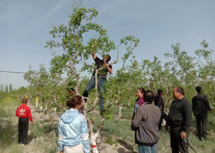 5月22日,组织尤喀克格西木艾日克村种植户在本村1组开展红枣修剪现场培训会,由优秀红枣种植户向大家传授红枣修剪技术,参加培训会的人都目不转睛,生怕错过了每一个细节,并不时发问。