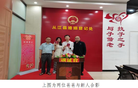 2023年5月24日下午,静怡的午后艳阳高照,从江县政务服务中心婚姻登记窗口迎来四位喜气洋洋的申请人,通过询问和了解得知,是张先生和石女士来申请办理结婚登记,作陪的是两位准新人的爸爸。来自从江的石女士与来自凯里的张先生相识于大学校园,经过五年多的爱情长跑,使这情侣更坚定的相信彼此就是自己要想守护一生的爱人,恋爱是两个人的事,但婚姻却是两个家庭的事情,看到两位爸爸脸上洋溢着幸福的笑容,这对准新人的婚姻一定得到了家里长辈的真诚祝福。窗口婚姻登记员按照相关程序迅速审核申请材料,立即为新人办理了结婚登记,办理结束后婚姻登记员邀请两位爸爸在神圣的颁证台上为两位新人颁发了结婚证书,见证了晚辈的幸福时刻,这种仪式感满满的领证方式,既简洁明快、又庄重热烈,同时也改变现在结婚“轻登记、重婚宴”的不良风俗,倡导婚事新办,传承优良家风。婚姻登记员看着两位新人一手持着结婚证书一手挽着各自爸爸离开的背影,心中的幸福感由然而生,愿他们以后的婚姻生活像这初夏五月的绿植一样一直向阳而生。(图文:杨存元)