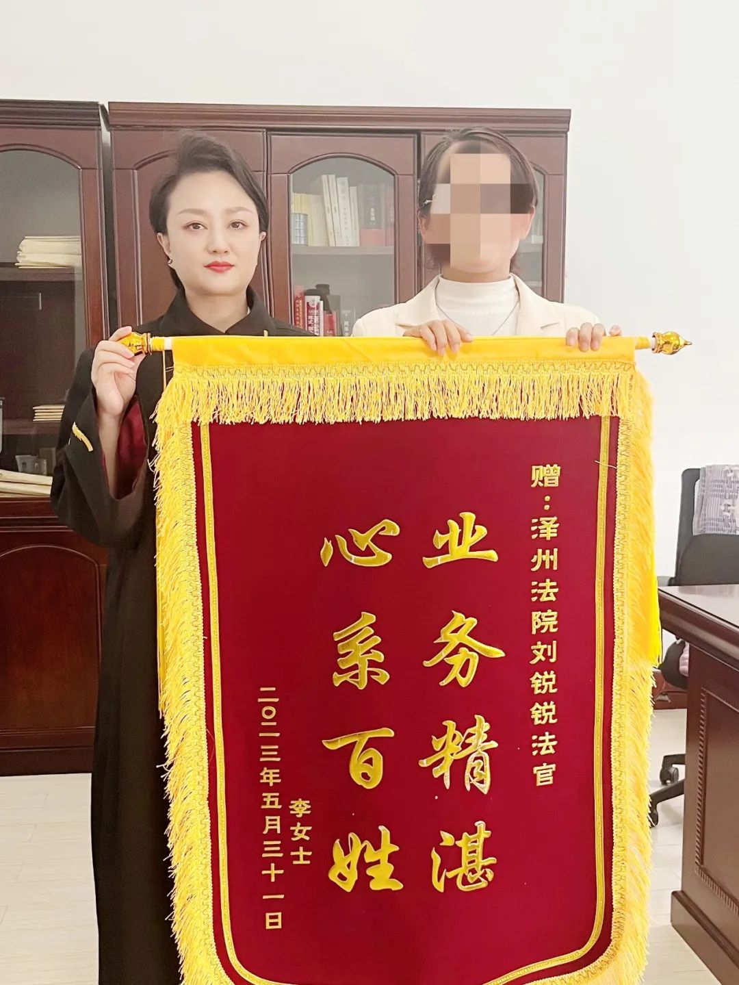 的锦旗送到了刘法官手中,