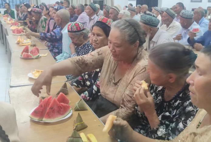 老人们是本村发展的见证者,年轻时为了本村的建设出过不少力,今天邀请大家来共同迎接端午佳节,就是让老人们不忘初心,老有所为,永远跟党走,而且要把自己好的信念、好的家风、好的传统传承给下一代,就像端午节日吃粽子一样。活动现场还为老人们准备了西瓜、甜瓜等夏日瓜果,让老人们和工作队、村干部共同品美食的同时,话团结、感党恩,永远跟党走,继续共同维护这民族团结、社会安定和谐的良好生活。