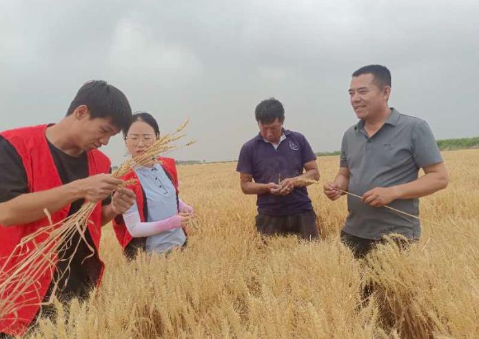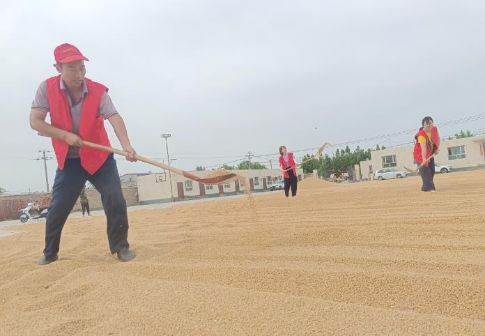 在晒场,党员志愿者们身穿红马甲,正在忙碌着,帮助种植户们倒粮、晒粮,现场一派热火朝天的丰收景象。这是该村党员助力“三夏”的一个缩影。党员干部们个个挥汗如雨,不怕苦、不怕累,用忙碌的身影、辛勤的汗水,努力践行“我为群众办实事”的初心与使命。
