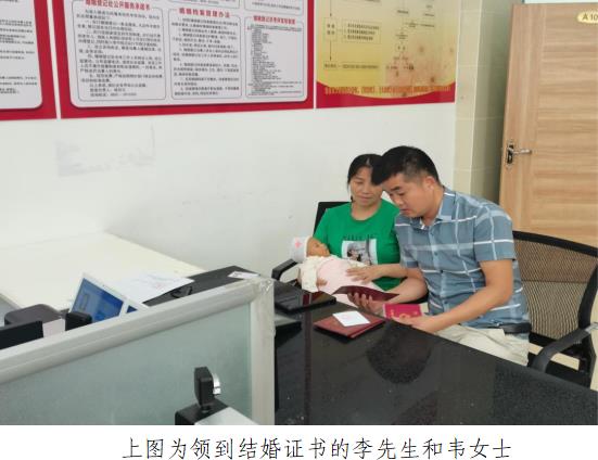 据悉,这对夫妻的小孩已出生50多天,因没有结婚证而上不了户,6月30日下午李先生和韦女士到婚姻登记窗口咨询办理结婚登记事宜,了解发现韦女士手中持有的相关材料不符合要求,当时婚姻登记员一次性告知了当事人且发放了一次性告知单,文化水平不高的两人似懂非懂的点点头又摇摇头地起身准备离开,望着当事人无助的眼神,婚姻登记员再次邀请他们坐下来,叫李先生用笔一步一步记录下来,如何去外省调取韦女士的相关档案。根据提示当事人顺利地调取到了相关材料,于7月14日再次到婚姻登记窗口申请办理结婚登记,就出现了上面感人的一幅画面。