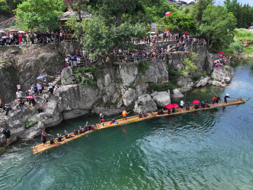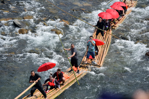 2023年7月31日,各族同胞在贵州省从江县刚边壮族乡刚边村体验竹排漂流活动。