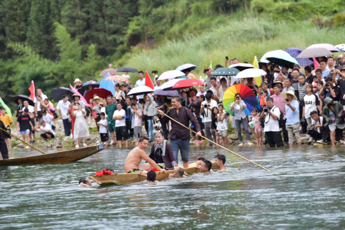 当日是农历六月十四日,2023年“醉美壮乡·超脱刚边”跳水节在贵州省黔东南苗族侗族自治州从江县刚边壮族乡刚边村举行。黔桂边界临近村寨各族同胞身着民族盛装欢聚在“三百河”河畔,举行“百杯煨酒石”祭祀、跳水选亲、壮歌对唱、竹排漂流、戏水表演等一系列壮乡民俗活动,喜迎八方宾客欢庆佳节。(通讯员:龙梦前)