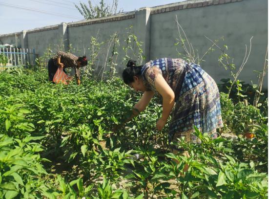 “你们家菜园子里的辣椒长的真好啊,就这么点地,少说能出200公斤辣椒,少说能卖个千把块,维持一个月的家庭开支这不就够了吗?当初让大家种辣椒,都说种不好,不会种,这不就长成了么……”托万塔尕克村第一书记与群众热娜古丽·尼亚孜在菜园子内边摘辣椒边说道。