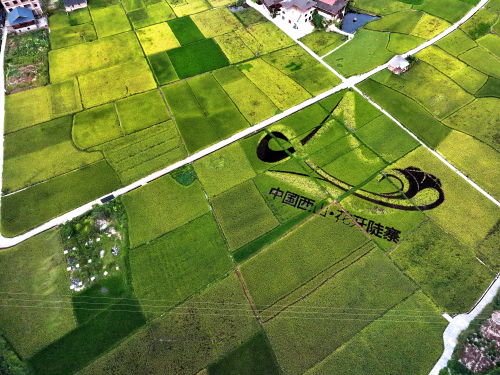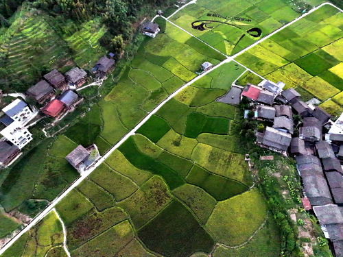 图为:2023年8月17日,在贵州省黔东南苗族侗族自治州从江县西山镇陡寨村拍摄的田园风光(无人机照片)。