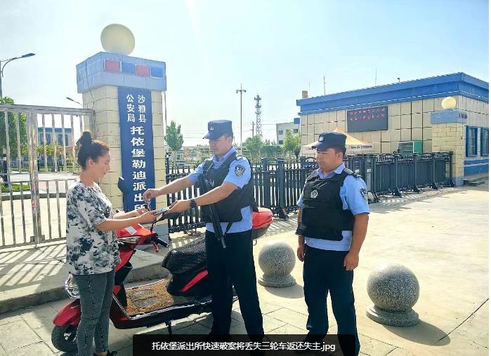 8月20日,沙雅县塔里木乡仓塔木村群众丢失价值5600元的三轮电瓶车一辆。民警通过走访和调查,仅用5小时快速破案,于8月21日,将其丢失三轮电瓶车完好交还失主。