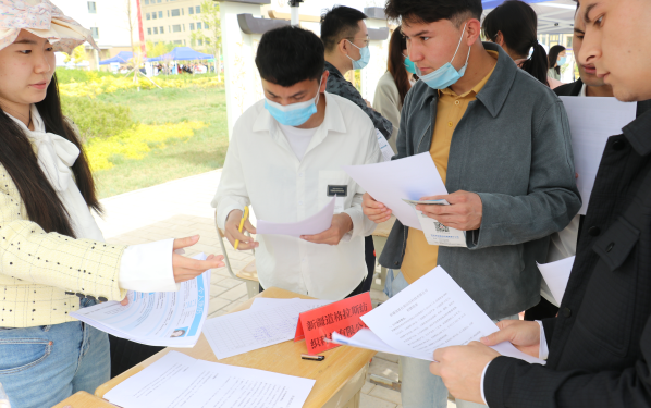 图为:近日,温宿县人社局携县域多家企业成功举行高校毕业生专场招聘活动,全县多家企业聚集参加,阿克苏中消云智慧消防科技有限公司展位前多名大学生了解企业状况、工资待遇等信息 (江凯摄)