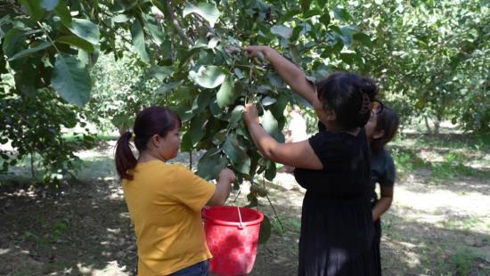村民哈儿尼沙·依米提家种了3亩核桃,为了尽快将核桃采摘送到合作社进行统一收购,她叫来亲朋好友帮忙采摘。