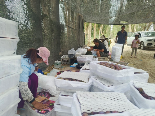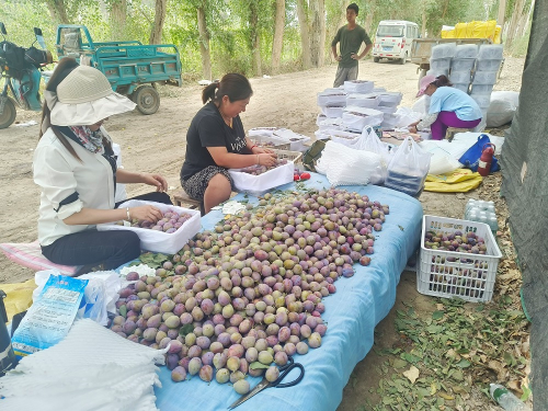 在新疆生产建设兵团第一师阿拉尔市九团十连职工黄永兵西梅园里,一派丰收忙碌景象,工人们忙着采摘西梅,分类整理包装,处处洋溢着丰收的喜悦。