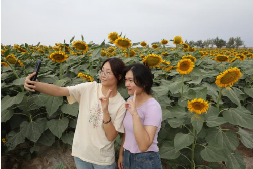 9月4日,新疆生产建设兵团第一师二团职工在葵花地拍照赏景。