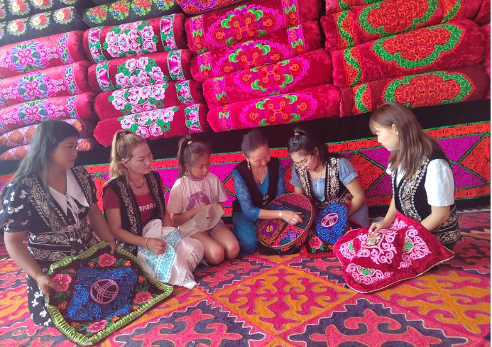 布茹丽·斯开克不仅是柯尔克孜族刺绣第四代传承人,还是柯尔克孜族刺绣授课辅导班主任。她说,传统技艺合作社成立以后,给予他们很大的帮助,在这个平台下,他们还有机会在网络上与其他传承人互相学习。现在,他的徒弟大概有300多名。
