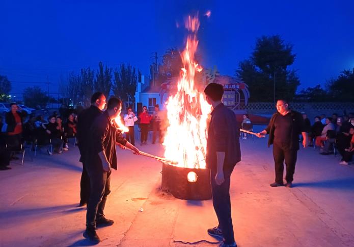 晚会现场,努尔巴格乡各民族同胞共同点燃了象征吉祥幸福、快乐祥和的主火把,熊熊篝火照亮各民族同胞的笑脸,也点燃了全场所有人的激情,大家一起手拉手,像石榴籽一样紧紧抱在一起,围着篝火尽情歌舞,大家共叙民族团结情,共跳民族团结舞。