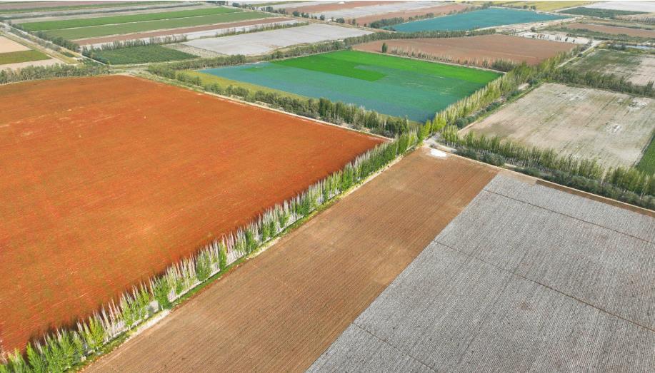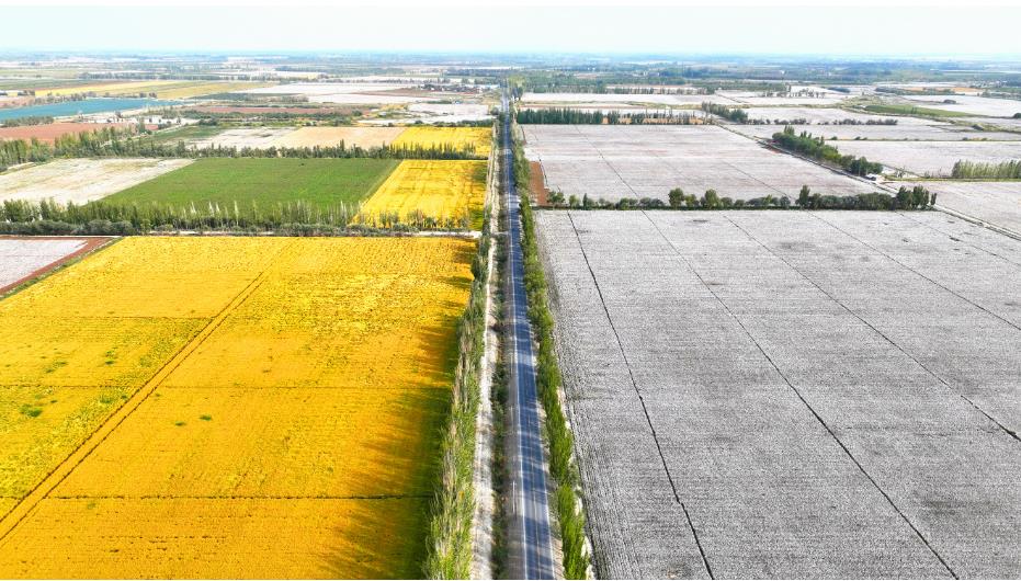 寒露至,秋意浓。地处塔克拉玛干沙漠北缘的新疆生产建设兵团第一师阿拉尔市七团玛滩镇广袤大地色彩斑斓,田间道路、防护林相互串联,与白色的“棉海”、金色的稻田、红色的辣椒田、绿色的蔬菜、秀美的连队相映成趣,呈现出一幅迷人的秋收“丰”景。