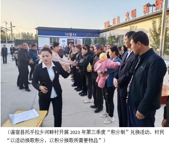 托乎拉乡河畔村党支部委员、村委会委员王炎义说:“‘积分制’唤起了村民的责任意识,充分调动了村民参与乡村治理的积极性、主动性、创造性,通过实行‘积分制’,村民将‘村里事’当成‘家里事’来关心。”河畔村170户村民在积分的激励下,积极参与乡村共建共享,自觉参与村庄人居环境整治,村民之间“赚积分”“比积分”热情高涨,互帮互助、志愿服务蔚然成风,乡村焕发出新时代文明新气象。