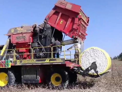 在九团4连职工张定林的棉花地里,伴随着轰隆隆的机械声,一台集采摘、压缩、打包为一体的自走式打包采棉机马达轰鸣,在棉海里来回穿梭,快速地将棉花从棉杆上脱离,并通过气流将棉花推送到储存车厢,棉花被打包成硕大的“金疙瘩”,整齐地排放在棉田,勾勒出一幅丰收的画卷。
