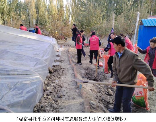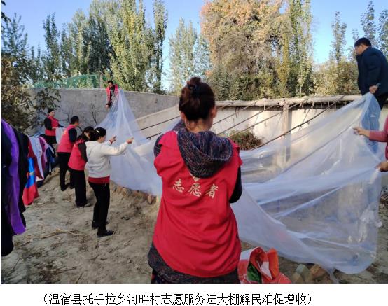 10月25日,温宿县托乎拉乡河畔村吐尼牙孜·托乎逊家一改往日的安静,突然变得格外热闹。身着“红马甲”的志愿者在蔬菜大棚前忙前跑后,拉膜铺展,铲土装袋,培土压膜,翻地种菜,大家分工协作,有说有笑,沉浸在劳动的喜悦中。