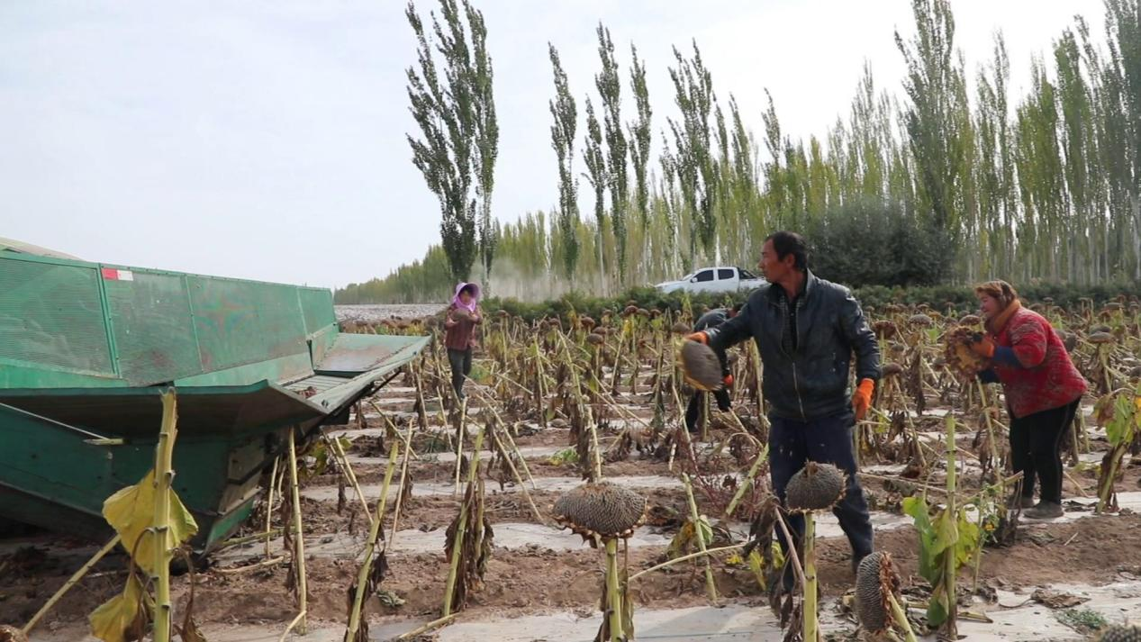 眼下,新疆库车市墩阔坦镇繁荣村的200余亩向日葵正迎来大面积的收割期,种植户和村民们抢抓时机进行收割晾晒、分级装运,一派热闹繁忙的丰收盛景。