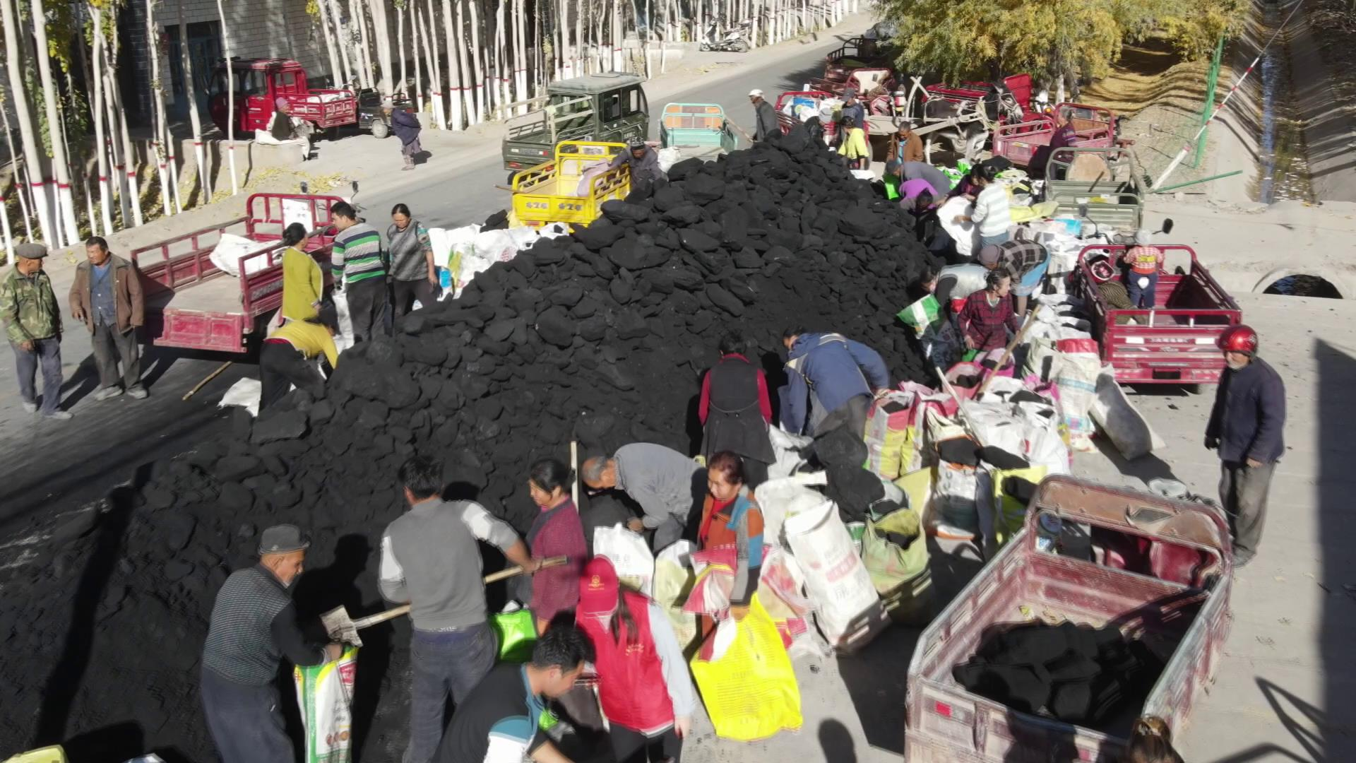 在库车市比西巴格乡东风村村委会外的空地上,村“两委”、工作队和党员志愿者们齐上阵,身披“红马甲”,和村民们相互配合,干劲十足,一起用双手和铁锹将过冬煤装入塑料袋中,整个过程取煤、称重、登记、装车、运输都井然有序,现场一派热火朝天的景象。