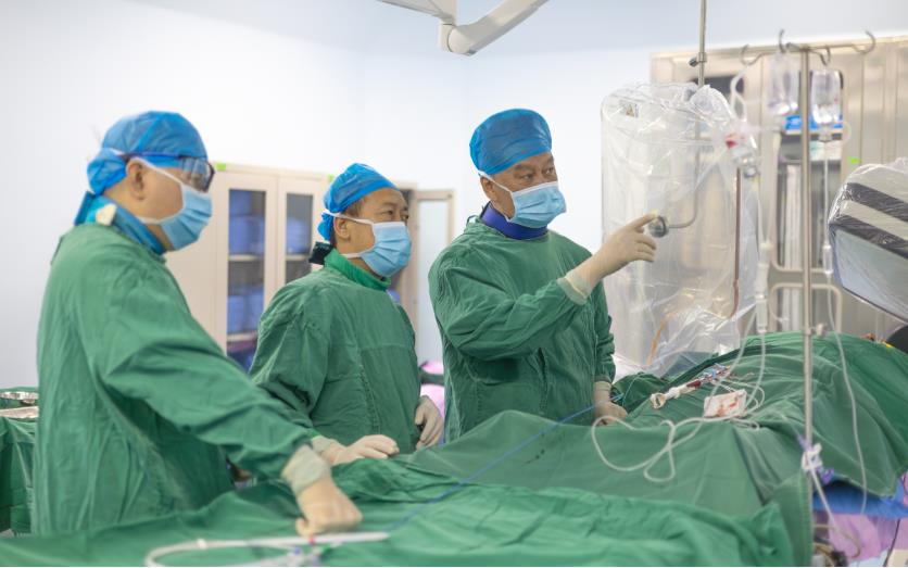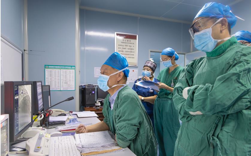手术继续进行,团队应用介入的手段开通阻塞的血管,放入支架,使血液再次“灌溉”心肌。抢救争分夺秒,惊险的一幕却再次出现,张先生再次出现室颤,四肢抽搐,意识丧失。紧急除颤、用药......在茶春喜教授、崔海东主任的指导下,黄春主任医师、陈海刚主治医师主台,从容细心操作,与死神极限拉扯,一步步逼退死神,张先生成功被救回,并成功开展了手术,解除了危机。至此,张先生的救治圆满成功,医护团队们紧紧悬着的一颗心也终于放下。