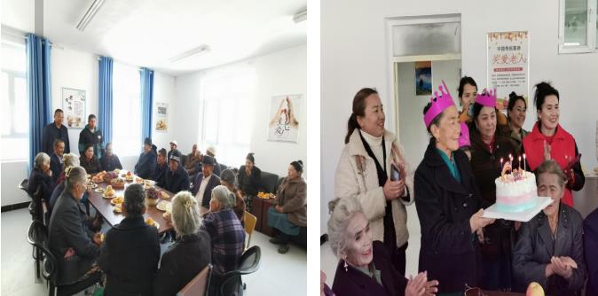 在托万托喀依村一老一小关爱服务中心的疗养室和理发室里,有专业的人员为20多名老人们理疗和理发,由中国银行阿克苏地区分行驻吐木秀克镇托万托喀依村第一书记张磊在疗养室给老人们介绍理疗的好处,并在此期间陪老人们聊天、谈家常,使得老人们感受到了党和政府的关怀。之后在敬老室,志愿者们准备为6名老人过生日,托万托喀依村的老人们齐聚一堂,其乐融融。活动中,村妇联干部图妮萨克孜·阿布力米提端上蛋糕,点燃蜡烛,老人们一起唱生日歌、许愿、祝福,在场的老人和工作人员不时传出欢声笑语,现场洋溢着一片欢乐祥和的气氛。