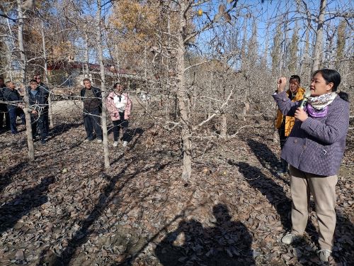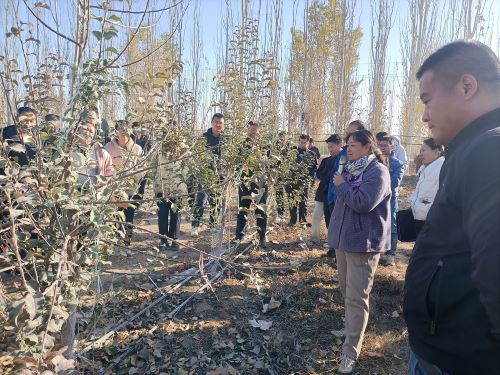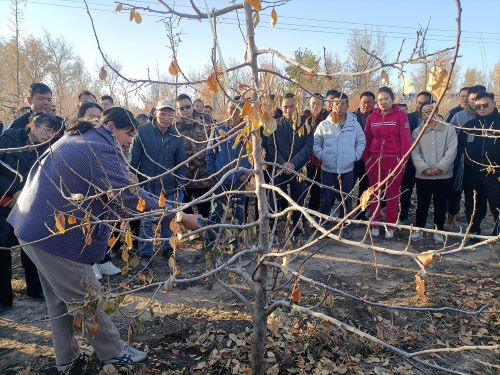11月17日,新疆生产建设兵团第一师农业农村局组织的基层农技推广人员果树冬季修剪技能培训现场会在九团田间地头召开。培训班邀请果树培育专家钟聪慧,为180名参加培训的学员讲解苹果、杏李、西梅、香梨冬季修剪技术。