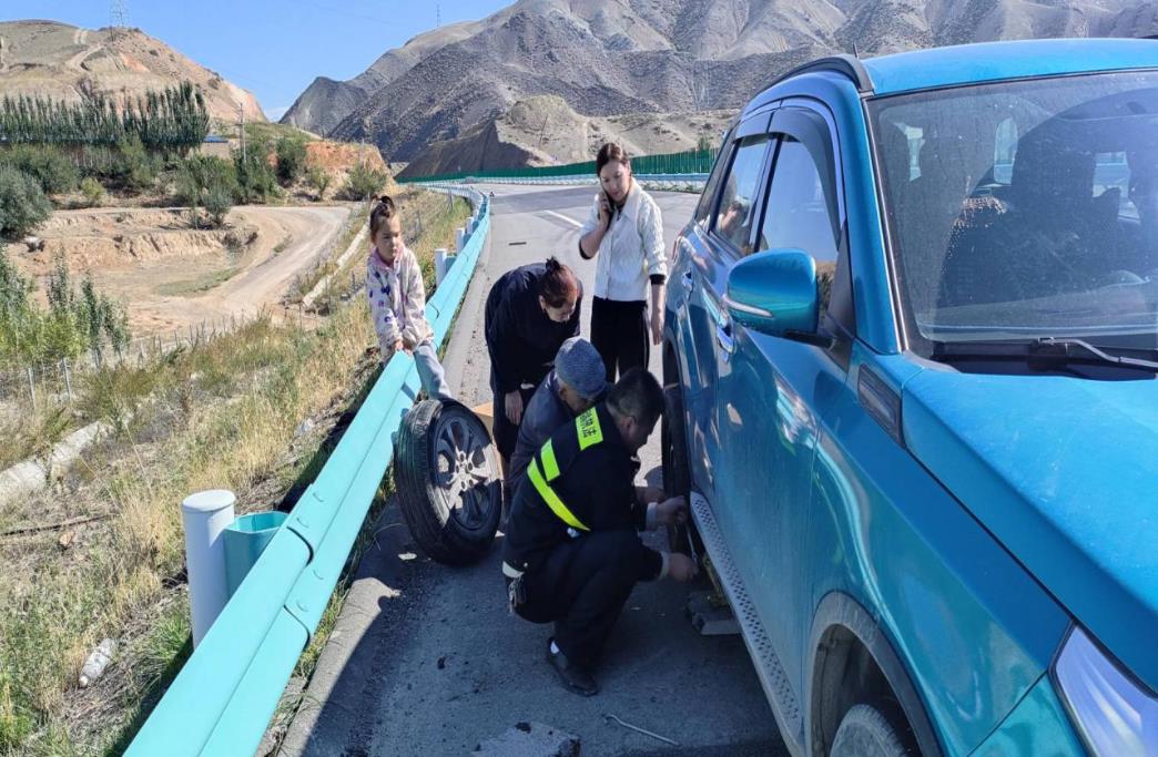 当天下午16时20分,尼勒克执法大队执法人员巡查至G578线K12+600米处,发现一辆小型轿车停在路边,车旁一名妇女抱着孩子站在路肩,情况十分危险。执法人员立刻规范停好执法车辆上前查看,经询问得知,该车因途中突然爆胎,被迫停靠路边,由于司乘人员没有更换轮胎的操作经验,更换不了备胎,正焦急等待救援。
