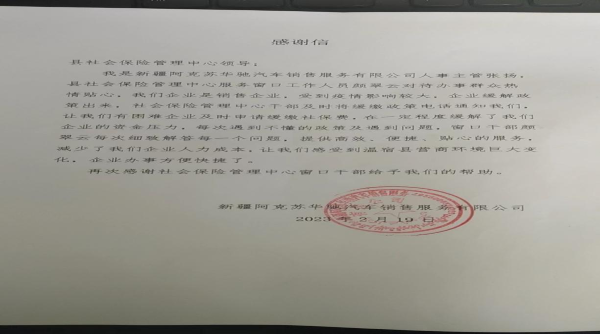 今年3月,温宿县行政服务大厅社保中心综合柜员制窗口收到了来自阿克苏华池汽车销售服务有限公司为社保中心工作人员送上‘锦旗’和感谢信表示诚挚的感谢。