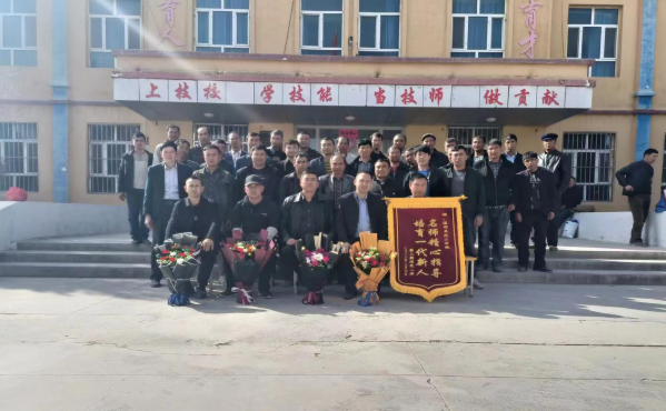 图为:2023年温宿县第三期钢筋工班培训学员参加职业技能培训取证后向温宿县技工学校赠送锦旗以示谢意。(江凯摄)