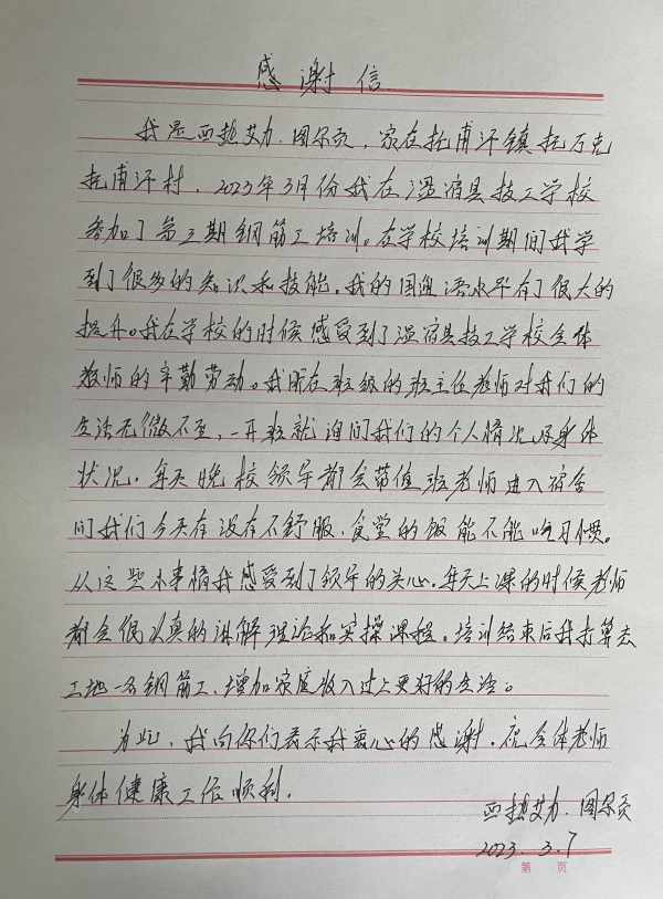 图为:2023年温宿县托甫汗镇托万克托甫汗村村民西热艾力·图尔贡参加钢筋工职业技能培训取证后向温宿县技工学校领导和教师致以感谢信(江凯摄)
