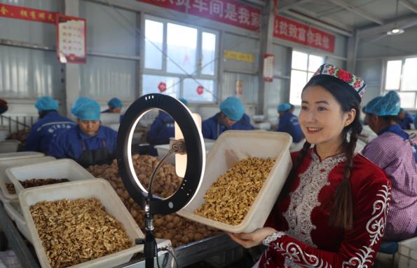 2023年12月7日,在在乌什县依麻木镇园丁林果种植专业合作社核桃加工生产车间。乌什县电子商务公共服务中心工作人员利用网络现场直播销售核桃干。近年来,乌什县通过“电子商务+直播+农户”方式,加快提升当地农村电子商务发展水平,助力乡村振兴。外力·克依木 摄