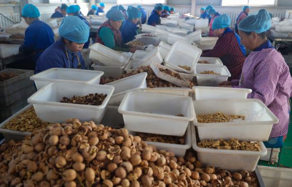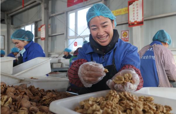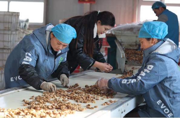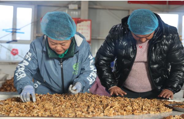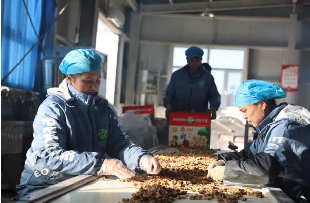 2023年12月7日,在乌什县依麻木镇园丁林果种植专业合作社核桃加工生产车间,大连赛恩进出口有限公司和乌什县依麻木镇园丁林果种植专业合作工作人员正在分拣核桃。外力·克依木 摄