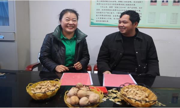 2023年12月7日,在乌什县依麻木镇园丁林果种植专业合作社办公室,大连赛恩进出口有限公司负责人和乌什县依麻木镇园丁林果种植专业合作社负责人再次2023年产核桃仁44屯采购合同。外力·克依木 摄