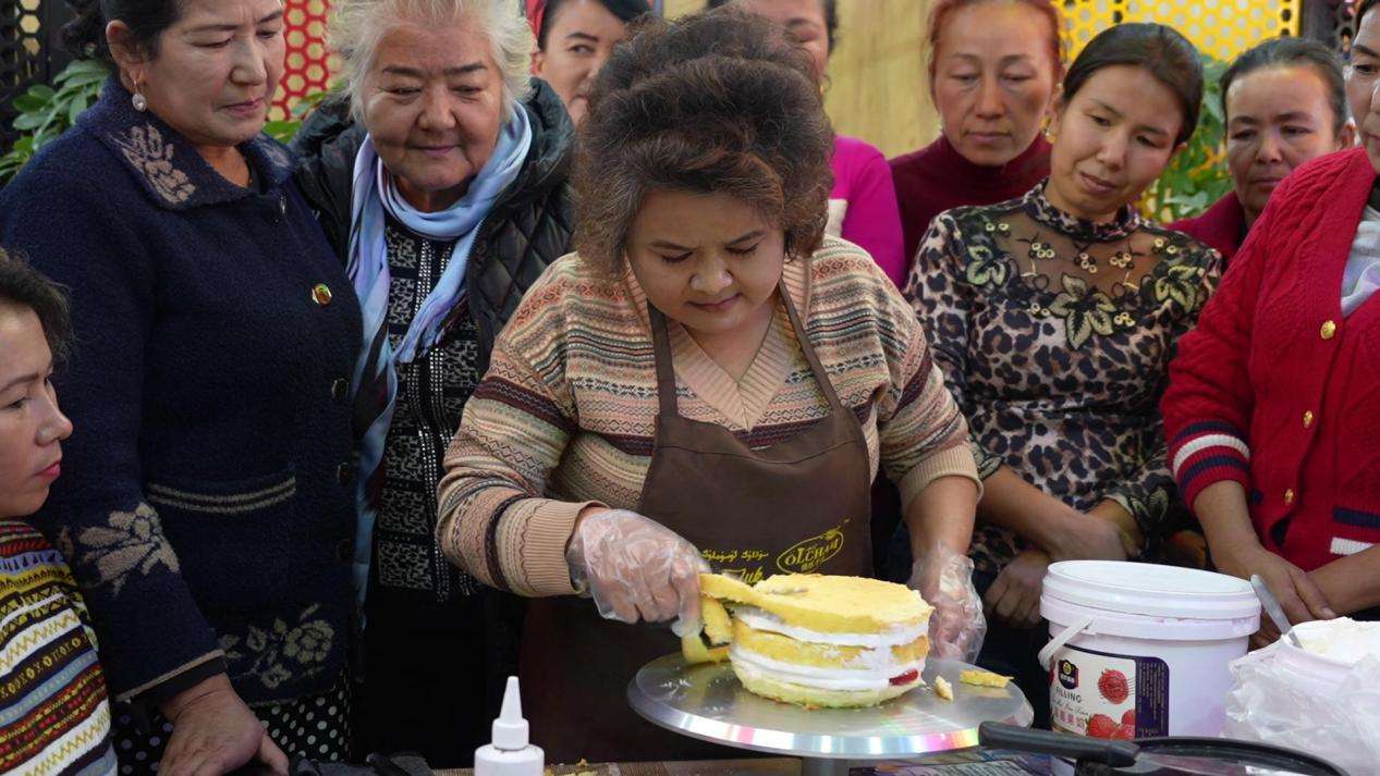 12月11日,在库车市墩阔坦镇墩阔坦村,村委会特邀请本村经验丰富的蛋糕师傅和美容美发师进行现场培训指导,妇女们正在老师的带领下,学习制作蛋糕、美容美发等技能。