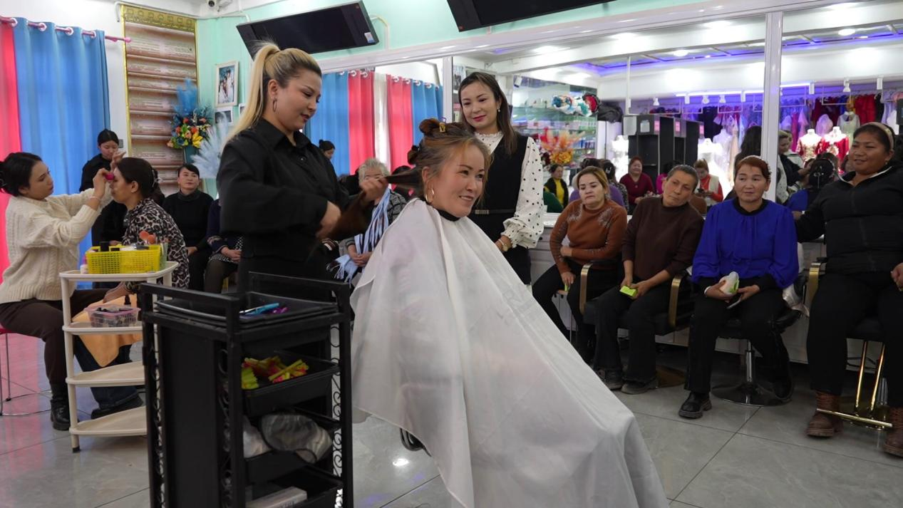 在墩阔坦镇繁荣村,工作队邀请专业人员为村民们提供美容美发和刺绣等技术培训。