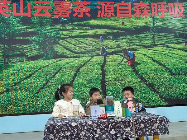 “县直机关幼儿园卖茶叶啦!各位进入直播间的帅哥美女们,请左上角点个关注。我们英山云雾茶清香翠绿、汤色透亮、口感醇香,大家快来下单呀,今天做活动,买一送一......”12月14日下午,英山县县直机关幼儿园四楼多媒体教室,大五班在课堂上萌娃们正在“直播”。也预示着一学期的茶文化展示活动课即将落下帷幕。