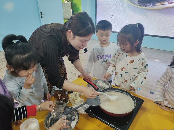 活动中老师们各显神通,使出“十八般”武艺,每一节课的教学内容“与众不同”、“别具一格”。你看,今天吴钰老师的中班社会活动《奇妙的下午茶》设计“查茶源”,“知茶味”,“探茶趣”等有趣的环节,让孩子们用白糖和英山茶煮出了一杯杯香喷喷的奶茶;方喜老师的大班艺术活动《英山茶末画》引导小朋友们运用点、画、捻、洒、推等方式,绘制茶末创意画,童趣的的画面、清香的茶叶,创新大胆的教学方式打破传统教学。金劝老师的《云雾茶叶蛋》让小班孩子动手操作利用英山云雾茶煮鸡蛋,活动上香气四溢,真正做到了寓教育于生活、游戏之中。
