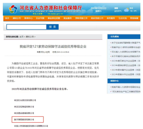 为激励守法诚信用工企业,营造良好社会氛围,近日,河北省人力资源和社会保障厅评定了新兴铸管股份有限公司等121家企业为2022年河北省劳动保障守法诚信优秀等级企业。按照有关规定,在无举报投诉情况下,各级人社部门两年内不再对评定为优秀等级的企业实施日常巡视检查、书面材料审查和专项检查等劳动保障执法检查,并享有优先推荐与劳动保障工作有关的评优资格。