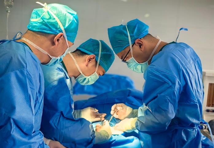 近日,第一师医院医共体总院下沉专家普外科一病区副主任李永崇、麻醉科医师谢世杰、普外科二病区医师李龙,带领一团分院外科医生为一位右腹股沟回纳包块患者开展“右腹股沟斜疝高位结扎+无张力修补手术”。