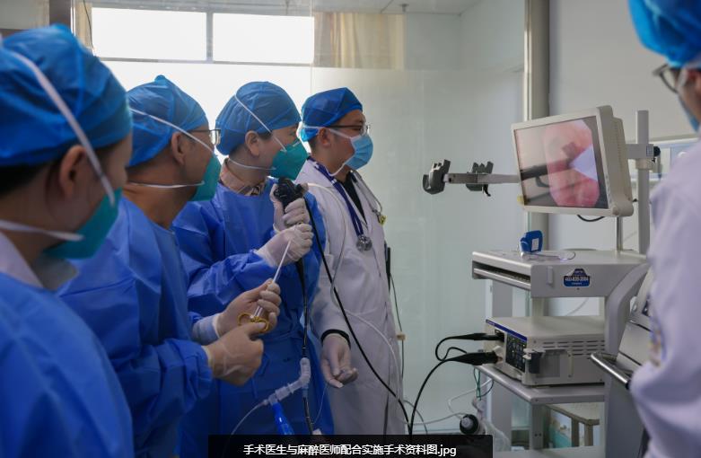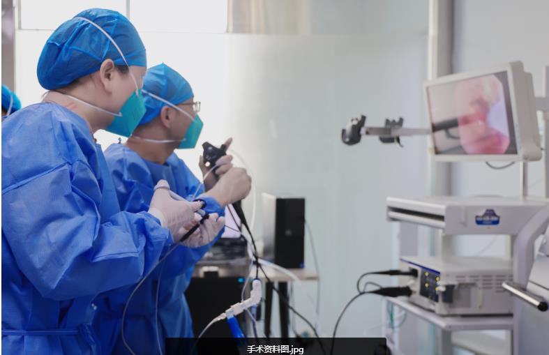 术中,许晓玲和尹黔龙医生密切配合,以高频电圈套将肿物切除,利用网兜完整取出一枚直径约1.5厘米的肿物,术中无出血。麻醉医师吴国荣及温银鹏术中全程严密监测患者各项生命体征并进行气道管理,针对预估风险,严格把控麻醉深度,为手术护台。