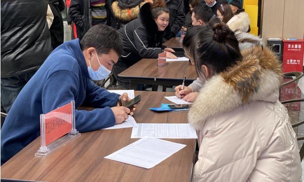 图为:2024年1月10日,温宿县2024年“就业援助月”专场招聘会在温宿县金华新村--方宿·沃意拉林果文化产业主题村拉开序幕,招聘现场求职者与用工企业达成就业意向,并签订就业合同。(江凯摄)