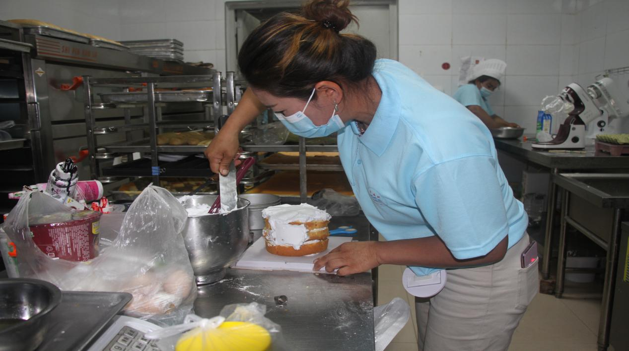 图为:温宿县柯柯牙镇萨依巴格村脱贫户劳动力阿依努尔·阿不都热合曼在县技工学校参加西式面点班职业技能培训,于2023年10月通过自主创业在阿克苏地区阿克苏市英巴扎街道英买里社区开了一家名为“阿克苏市思念蛋糕店”(江凯摄)