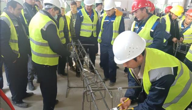 图为:2023年1月,艾力·吐拉甫与培训学员在温宿县技工学校建筑实训基地参加钢筋工实操职业技能培训(江凯摄)