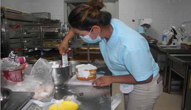 图为:温宿县柯柯牙镇萨依巴格村脱贫户劳动力阿依努尔·阿不都热合曼在县技工学校参加西式面点班职业技能培训,于2023年10月通过自主创业在阿克苏地区阿克苏市英巴扎街道英买里社区开了一家名为“阿克苏市思念蛋糕店”(江凯摄)