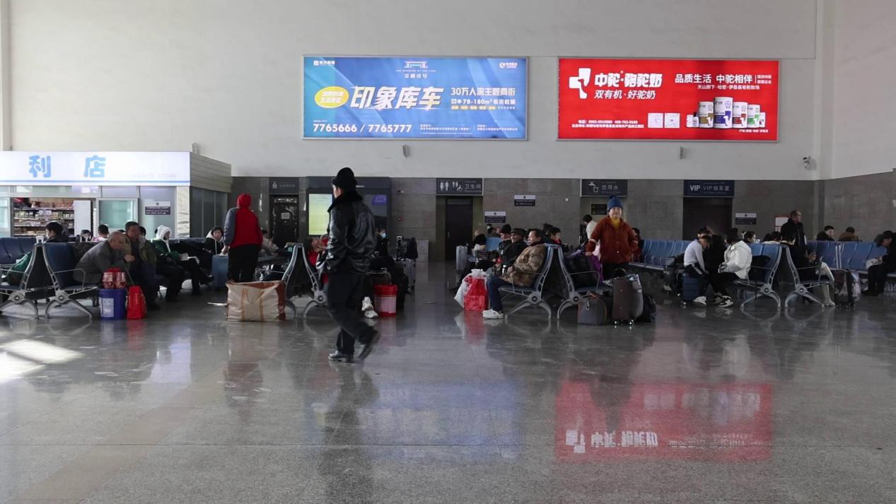 候车大厅内熙熙攘攘,座位上坐满了背着大包小包的旅客,车站大屏上滚动显示着车次信息。火车站工作人员为候车旅客提供热水、充电等便捷服务,让旅客在候车之际,感受到关爱与便利。