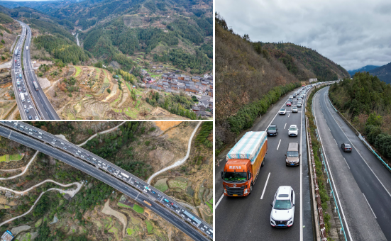 当日是春运第十天,在贵州省从江县洛香镇境内段俯瞰厦蓉高速,从广东往贵阳、成都等返程方向车流量明显增大,出现车辆集中和排队的情况。 (从江县教育和科技局:卢忠南)