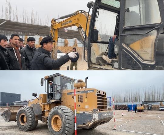 图为:2月7日,新疆阿克苏地区温宿县人社局联合县技工学校充分利用春节大批外出务工人员返乡有利时机,在县技工学校组织培训学员开展铲车职业技能培训,提升劳动者就业技能(江凯摄)