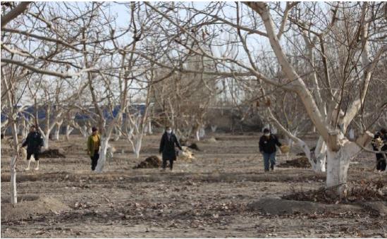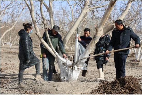 2024年2月17日,在乌什县奥特贝希乡苏盖特力克村林果业基地,当地村“两委”班子和村民做好核桃树防寒防冻工作。技术人员正在指导群众在冷空气来临前做好核桃防治知识。外力·克依木 摄