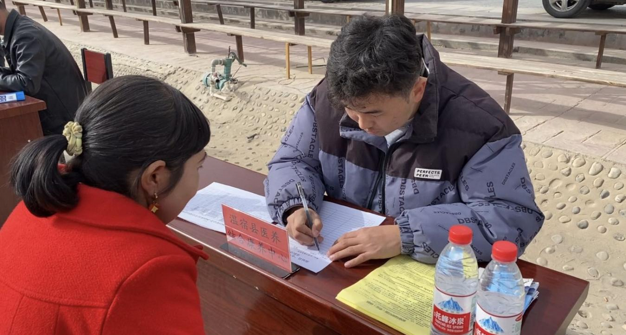图为:近日,温宿县人力资源和社会保障局联合托甫汗镇人民政府在温宿县托甫汗镇尤喀克托甫汗村组织召开“春风行动”招聘会,招聘会现场,求职者与用工企业达成就业意向并签订就业意向书(江凯摄)