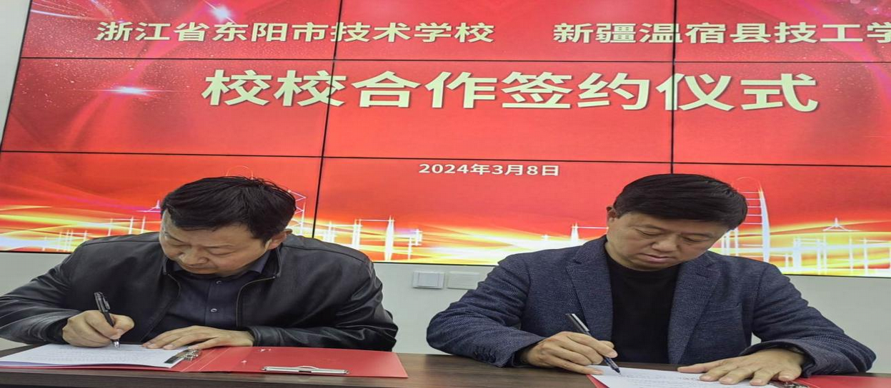 图为:为提升县级技工学校办学质量和办学水平,3月8日,新疆阿克苏地区温宿县技工学校专职副书记李朝阳与浙江省东阳市职教中心东技校区校长张华伟签订校校合作协议,共谋技能人才发展之路(江凯摄)